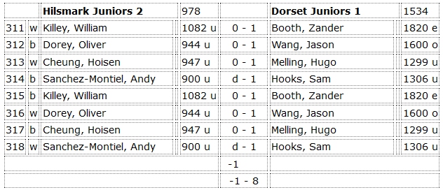 Another exceptional scoreline with a 7-1 win for Dorset Juniors 2. There were 2-0 wins for Jack Baskett, Jackson Vann and Michal Orszulak and a 1-1 draw for Arthur Hayward.
